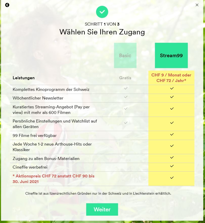 Das Stream99-Abo vom Streamingdienst Cinefile gibt es bis zum 30. Juni zum Aktionspreis von 72 anstatt 90 CHF (Jahres-Preis).