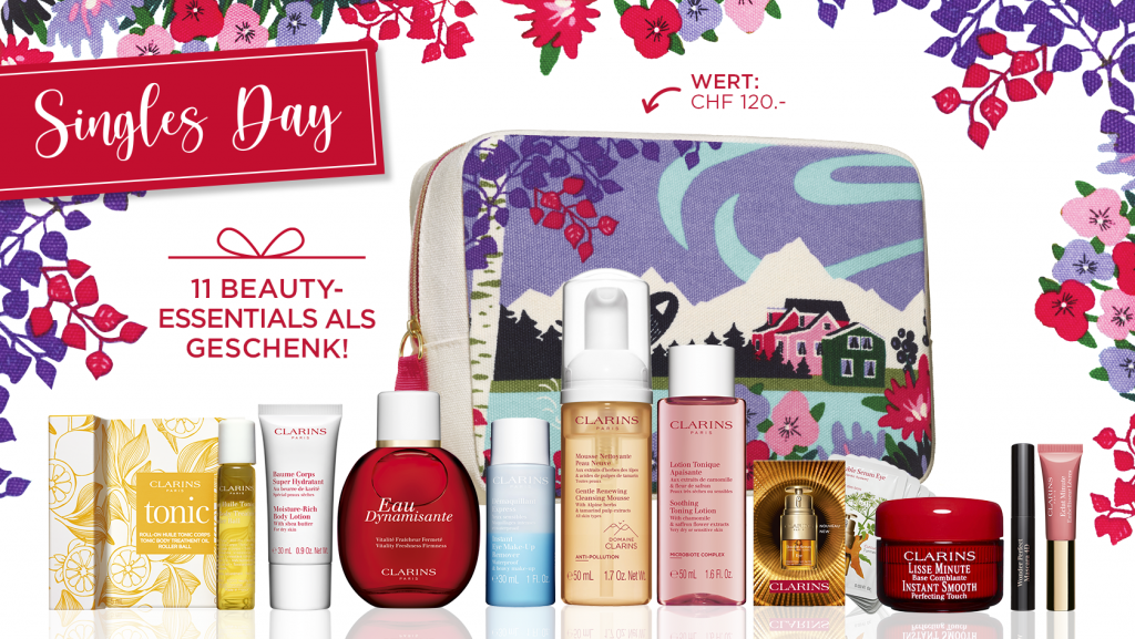 Erhalten Sie ein Kosmetiktäschchen mit 10 Pflege und Make-Up Produkten ab CHF 100.- Einkauf auf Clarins.ch.