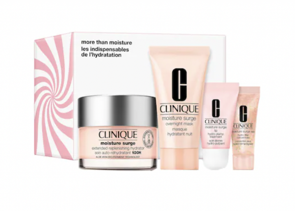 - ein Moisture Surge Lip Hydro Plump Treatment (7 ml): Die feuchtigkeitsspendende Lippenpflege beruhigt spröde Lippen und lindert Spannungsgefühle. Außerdem hilft sie der Lippenhaut dabei, Feuchtigkeit zu binden und ihre Geschmeidigkeit zu bewahren.