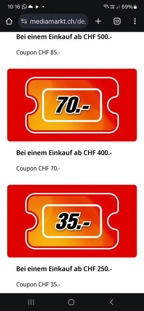 Bei MediaMarkt gibt es heute verschiedene Coupon, z.b. 35Fr ab 250Fr oder 70Fr ab 400Fr einkauf.