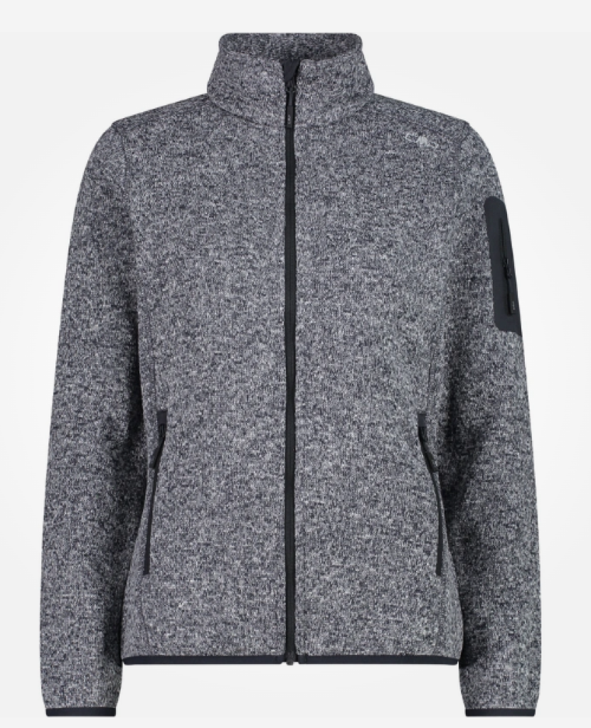 Die CMP Damen Strick Fleece Jacke überzeugt mit ihrem gestrickten, feuchtigkeitsdurchlässigen Kunstfasergewebe und der eleganten Jacquard-Optik, die sich überall sehen lassen kann. Sie dient als wärmender Midlayer mit einem Gewicht von 280 g/m² und sorgt so für optimalen Tragekomfort. Das Material ist angenehm weich und die Meshstruktur auf der Innenseite leitet Feuchtigkeit effizient nach aussen ab, was besonders bei schweisstreibenden Aktivitäten wie Wandern oder Trekking von Vorteil ist. Die Jacke bietet praktische Details wie seitliche Eingrifftaschen, eine Ärmeltasche sowie einen Full-Zip-Reissverschluss mit Kinnschutz. Mit ihrem Regular-Fit Schnitt und elastischen Einfassungen am Saum und Ärmeln passt sie sich gut an und bietet Bewegungsfreiheit