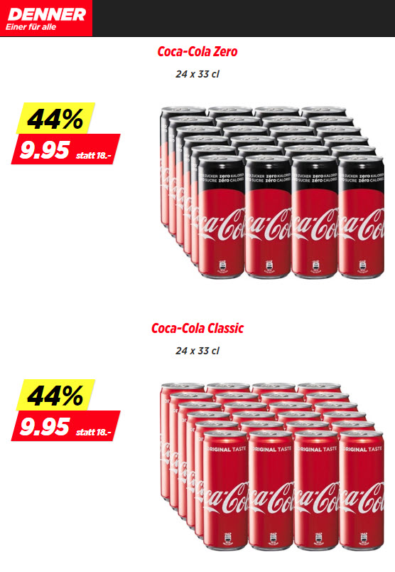 Bis zum 27.7.2020 gibt es in den Denner Filialen wieder mal das 24er-Pack 330ml Dosen Coca Cola Classic oder Zero für CHF 9.95.