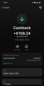 Also lade ich mein Coinbase-Konto mit Schweizer-Franken auf, erhalte Euro dafür, wandle die in einen Stablecoin um und am ende zahle ich im Geschäft mit einer Prepaidkarte mit Euroguthaben in Schweizer-Franken. Da geht alles für die Geldwechselgebühr drauf und vom Cashback bleibt nichts mehr über.