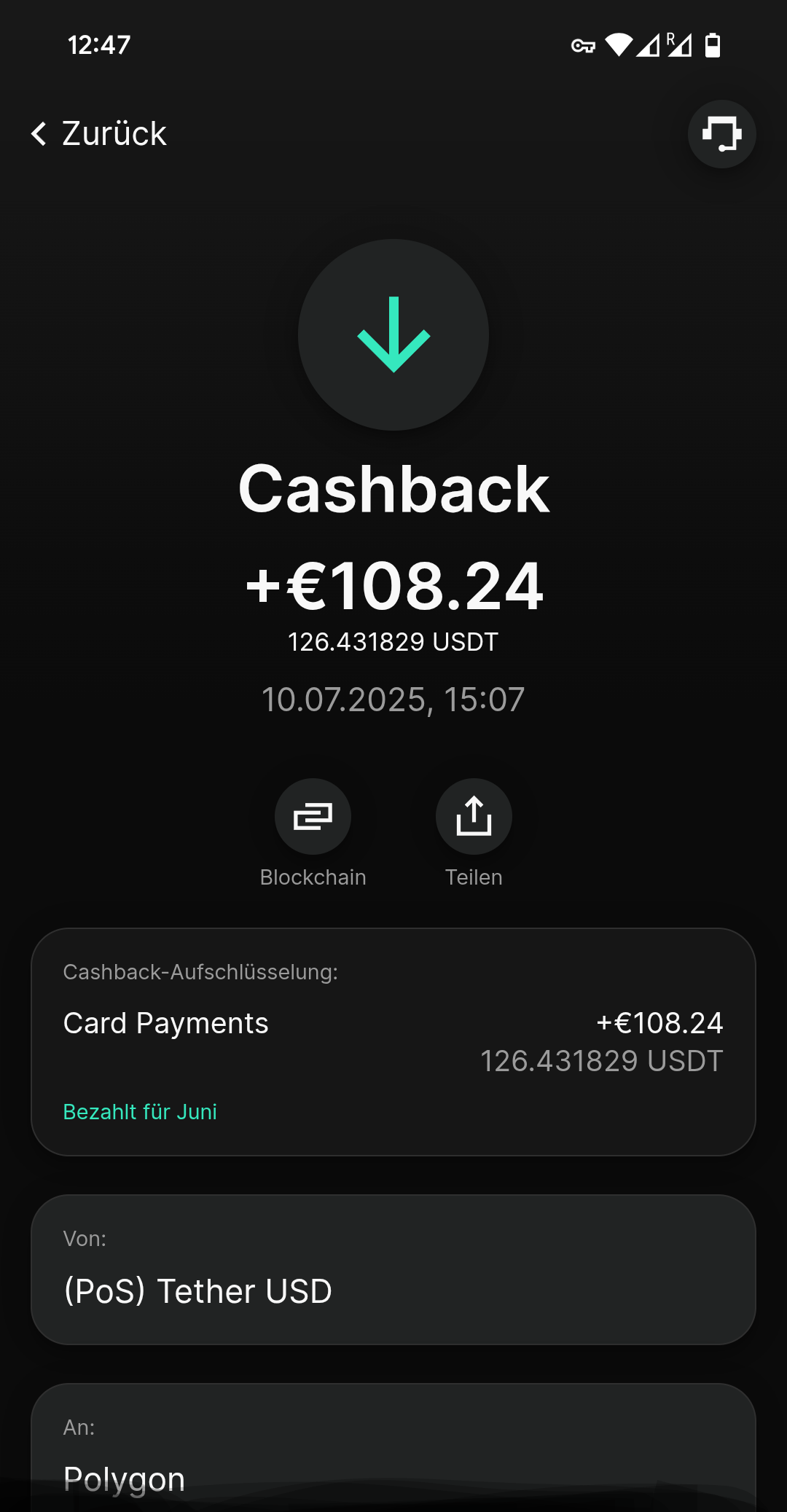 - 💰 Stabiles Cashback in USDC: Deine Belohnungen werden in USDC, einem 1:1 an den US-Dollar gekoppelten Stablecoin, ausgezahlt. Dieses Guthaben kannst du flexibel auf jede beliebige Wallet transferieren. Die Auszahlung erfolgt immer am 10. des Folgemonats.