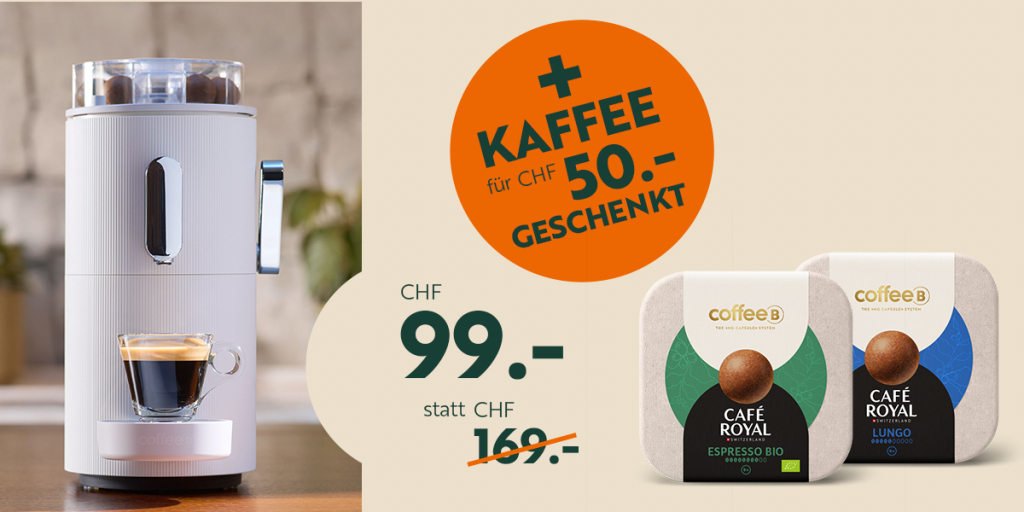 Unschlagbares Angebot: Spare diese Woche beim Kauf der CoffeeB Kaffeemaschine Globe für CHF 99.- und erhalte ein gratis Discovery Set mit Coffee balls im Wert von CHF 50.- dazu. Der aktuelle zweitbeste Preis nur für die CoffeeB Globe Maschine liegt bei 149 Franken.