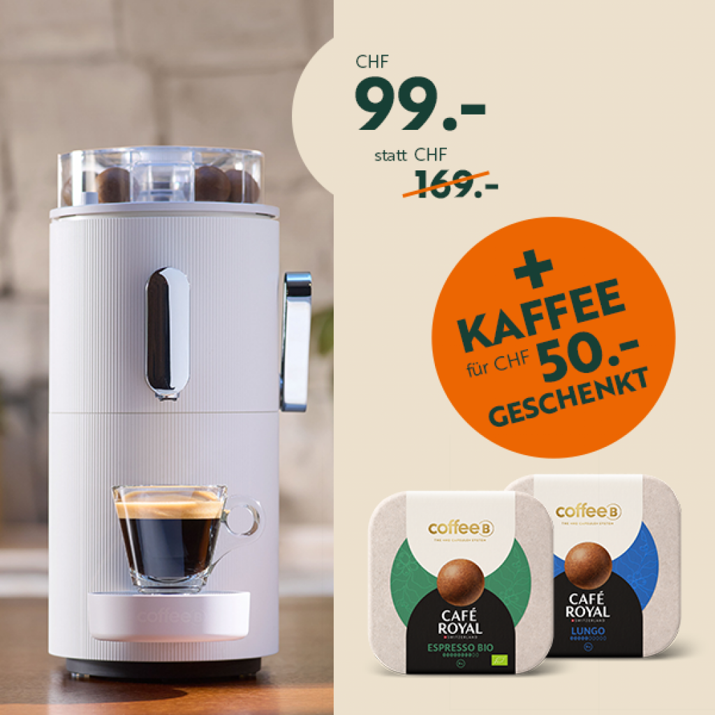 Unschlagbares Angebot: Spare diese Woche beim Kauf der CoffeeB Kaffeemaschine Globe für CHF 99.- und erhalte ein gratis Discovery Set mit Coffee balls im Wert von CHF 50.- dazu. Der aktuelle zweitbeste Preis nur für die CoffeeB Globe Maschine liegt bei 149 Franken.