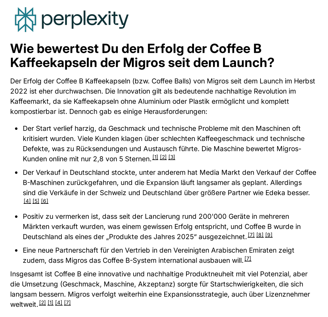 Mach Dir mal ein gesamtheitliches Bild dieses Kaffeekonzepts. Betreffend Nachhaltigkeit sicher Top, aber um extra umzusteigen, wenn es nur einen Anbieter von Kapseln gibt, etc. Machen einen Markteintritt schwierig.