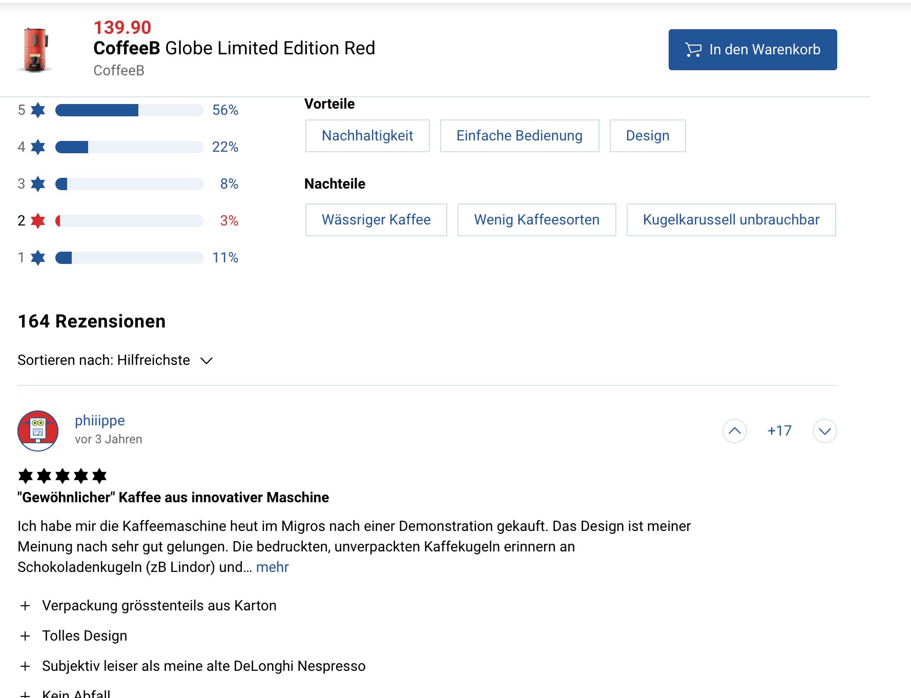 Viel Glück damit. Migros hat es kürzlich hunderte der besseren CoffeeB Globe Kapselmaschine unters Volk gebracht verlost, welche dann tutti.ch/Ricardo geflutet haben. Meine steht auch zum Verkauf da der Kaffee halt wirklich mehr als bescheiden ist...