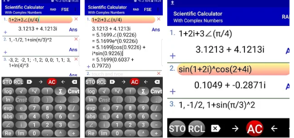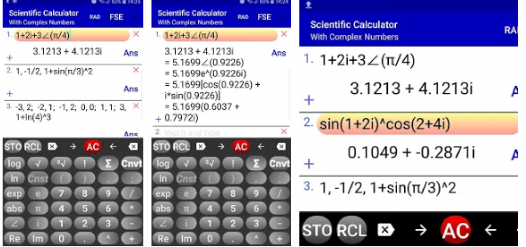 The calculations can be performed in RAD (radians) or DEG (degrees) mode. This comprehensive complex number calculator optionally converts the result or any complex number in standard form to polar and other modular forms and vice versa (long press i or ∠ to see all forms of the calculated result).