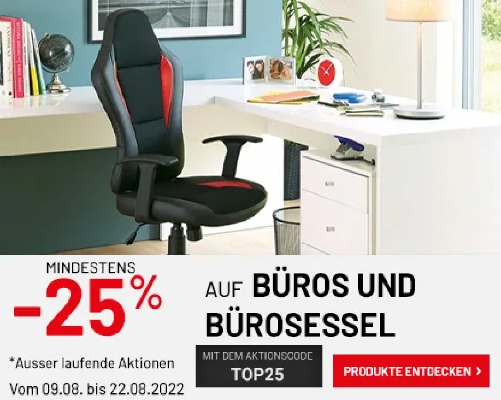 Bei Conforama könnt ihr bis zum 22.08. von 25% Rabatt auf diverse Büroartikel profitieren. Es ergeben sich so einige interessante Deals. Vor kurzem habe ich euch ja den elektrisch höhenverstellbaren Bürotisch vorgestellt, hier findet ihr auch dazu preiswerte Alternativen.