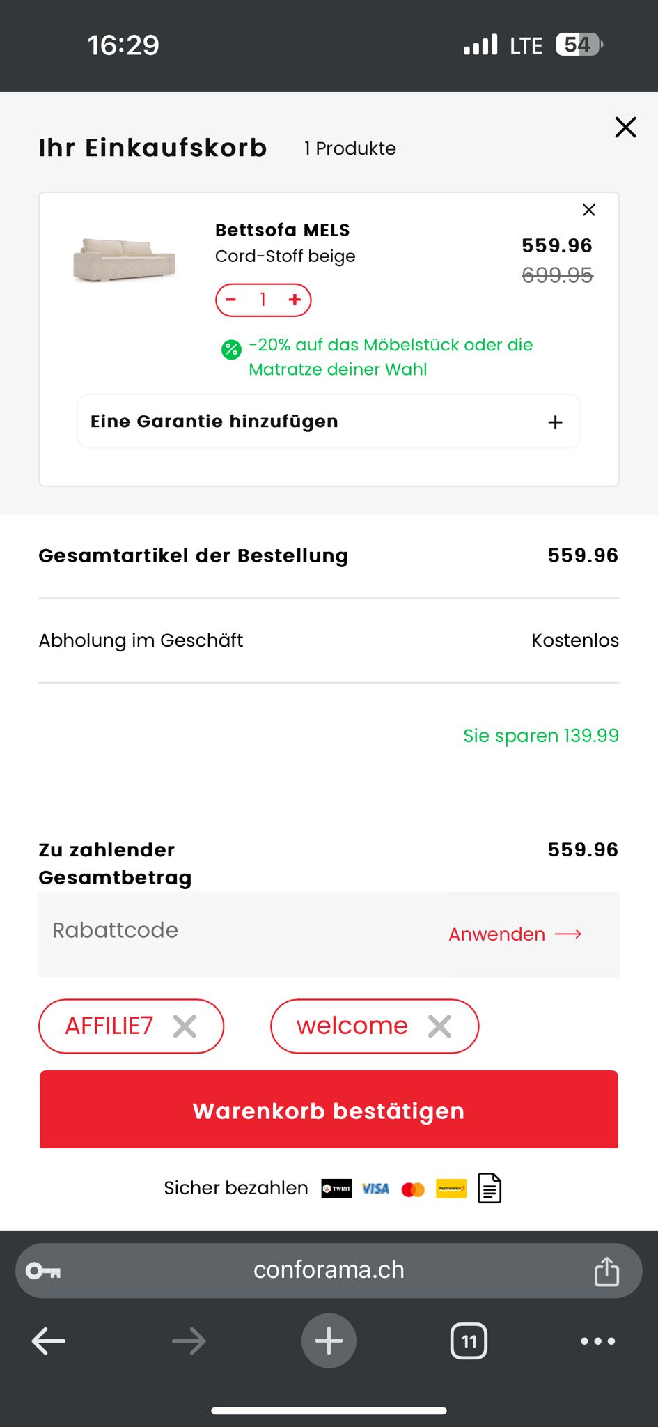 Normalerweise gibt es bei Conforama einen Gutschein über 10 CHF Rabatt ab einem Bestellwert von 50 CHF bei Newsletter-Anmeldung, sowie einen Gutschein über 20 CHF Rabatt ab einem Bestellwert von 200 CHF: Link.