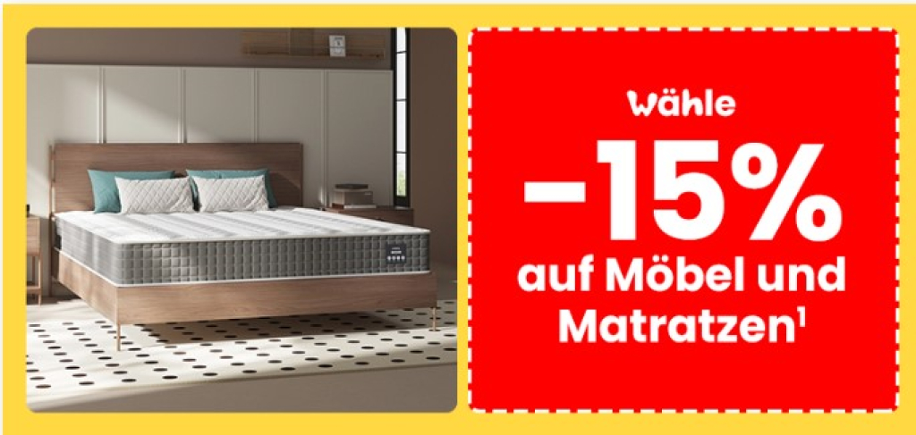 Bei Conforama läuft aktuell ein Möbel Sale mit 15% Rabatt auf ausgewählte Möbel und Matratzen. Die Aktion bietet eine gute Gelegenheit, Wohn-, Schlaf- oder Essbereich neu einzurichten oder gezielt einzelne Möbelstücke zu ersetzen. Vom Bett über Matratzen bis hin zu weiteren Möbeln profitieren Sie von attraktiven reduzierten Preisen.