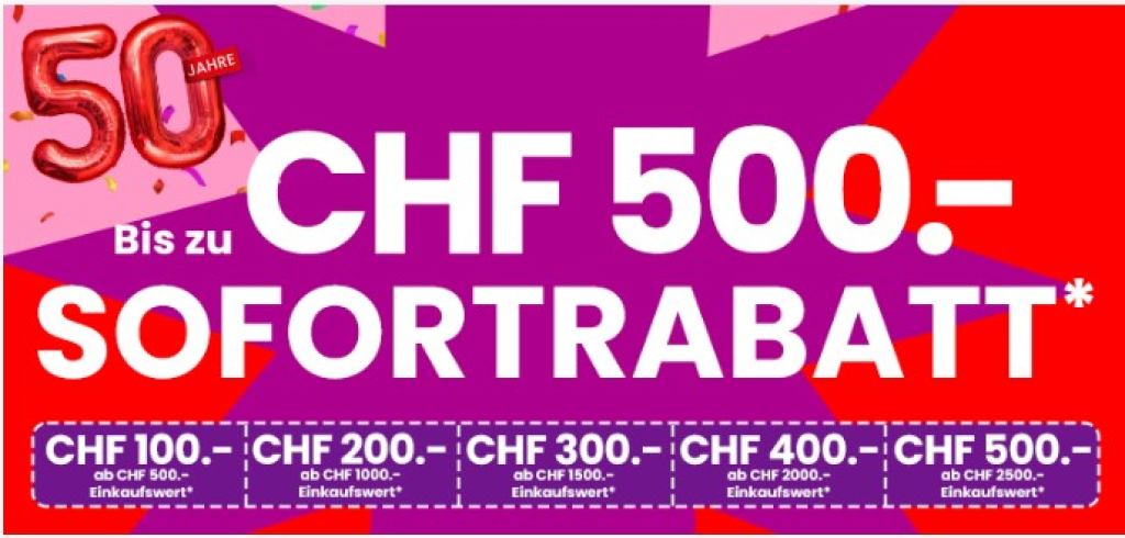 Bei Conforama profitiert ihr aktuell von einer attraktiven Rabattaktion auf Möbel und weitere Wohnartikel. Ab einem Mindestbestellwert von CHF 2’500.– erhaltet ihr bis zu CHF 500.– Rabatt auf euren Einkauf. Ideal, wenn ihr eine grössere Anschaffung plant oder euer Zuhause neu einrichten möchtet.