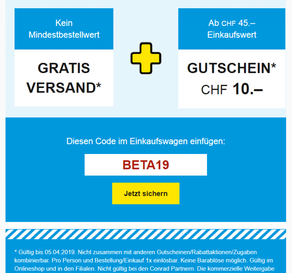 Der Gutscheincode BETA19 ist aus einem Newsletter-Mail von Conrad. Er kann im Einkaufswagen eingelöst werden. Der Rabatt und der Gratisversand funktionieren erst ab 45 CHF im Einkaufswagen.