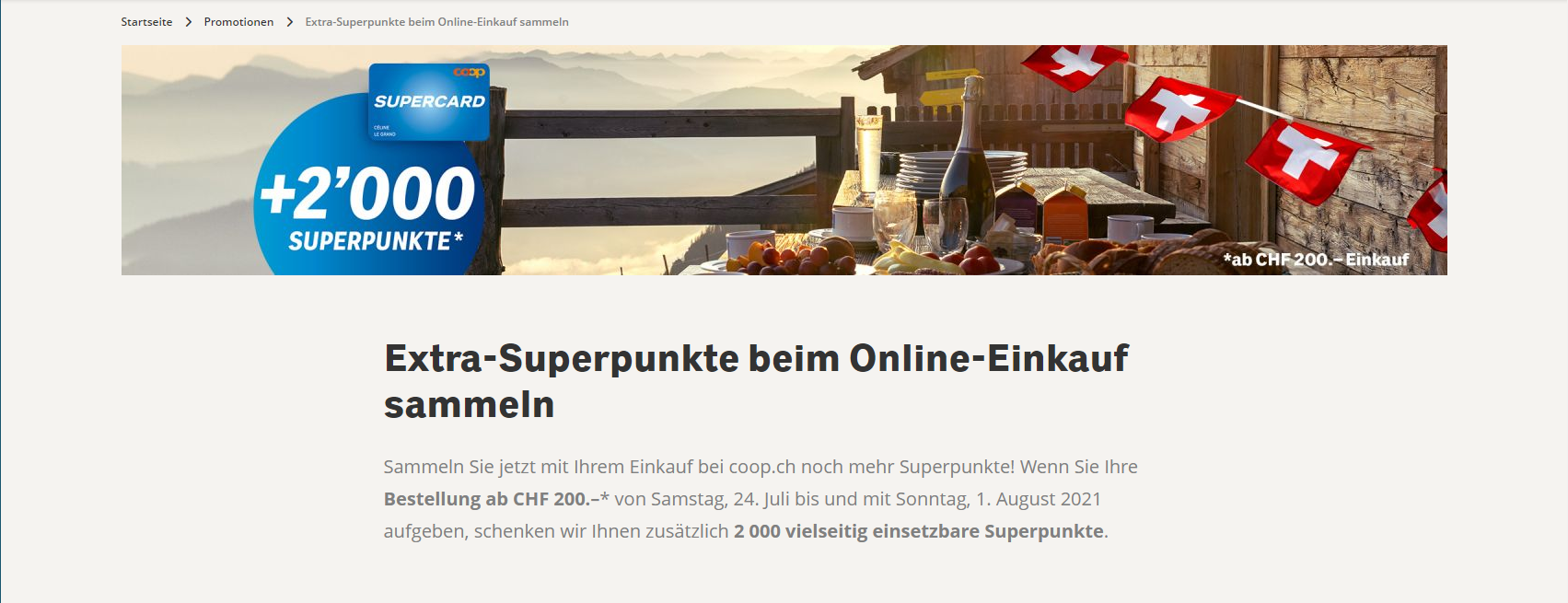 Bei coop.ch gibts derzeit bis zum 1.8. 2000 Superpunkte geschenkt, wenn ihr für mind. 200 Franken einkauft. Der Deal ist zudem perfekt mit der gratis Lieferung kombinierbar.