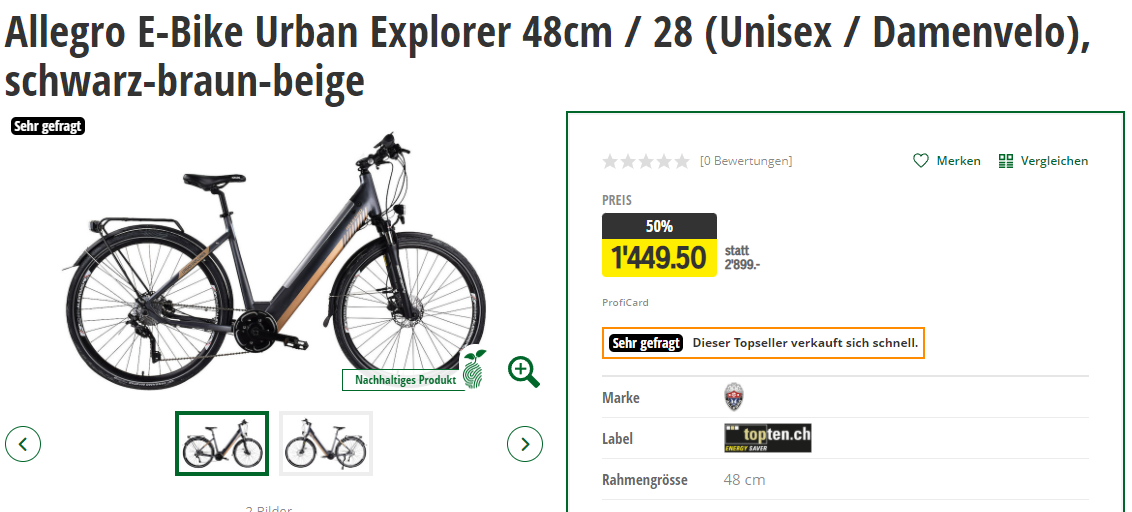 Besonders interessant dürfte das Angebot bei den E-Bikes sein, diese sind meist mit 40% Rabatt angeschrieben, eines sogar mit 50% Rabatt: