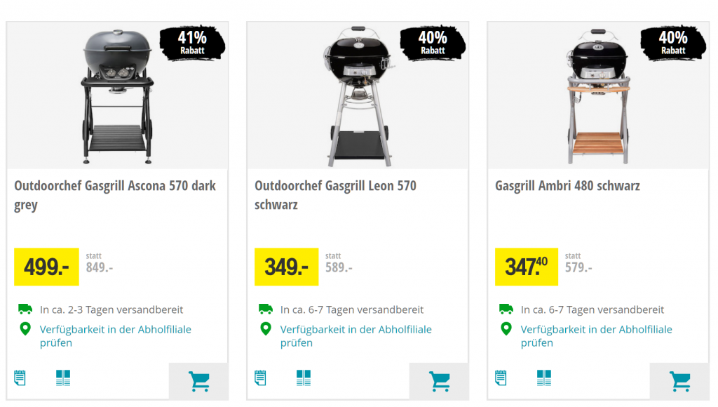 Hier ein paar Beispiele – die Grills sind soweit zu sehen laut toppreise jeweils der günstigste Preis in der Schweiz (deutlich), aber knapp keine Bestpreise.