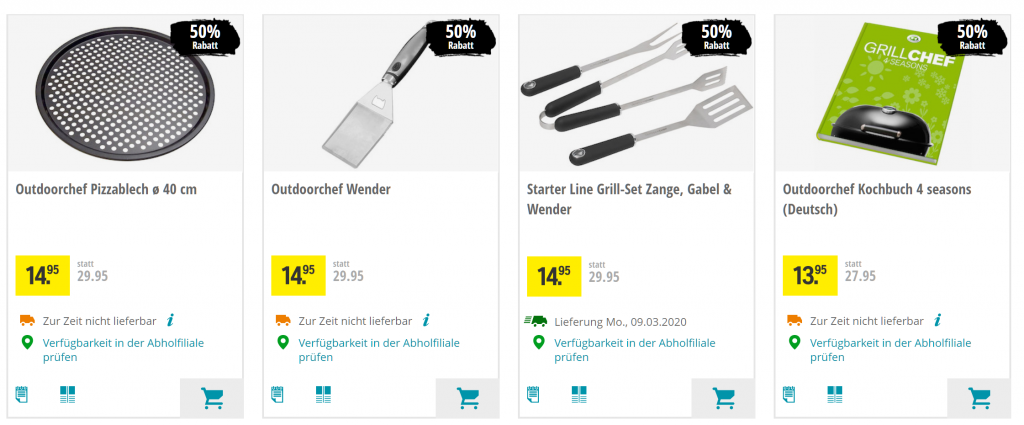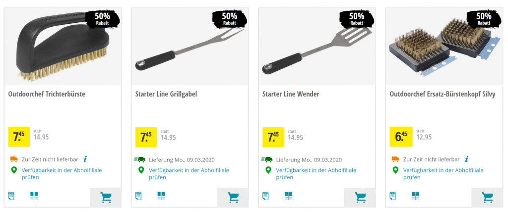 Bei coop bau+hobby gibt’s – die Grillsaison steht schon fast vor der Tür – derzeit 50% Rabatt auf praktisch alle Artikel von Outdoorchef. Schade ist, dass die meisten Artikel online nicht verfügbar sind. In den meisten Filialen hat es aber noch Bestand. Also online reservieren und dann später in der gewünschten Filiale abholen – so ist man sicher, dass es auch noch alles hat.