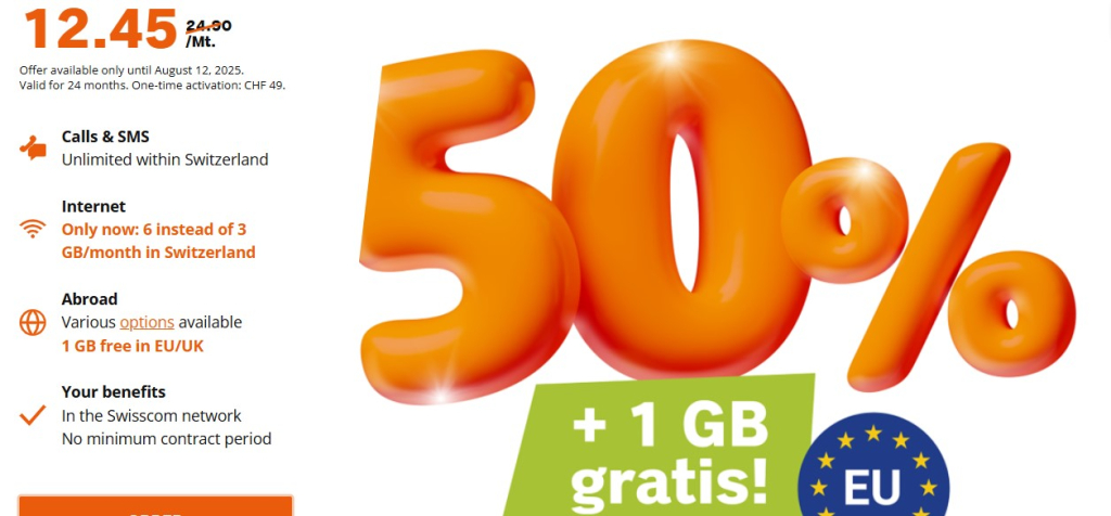Dieses Angebot ist am Feiertag 1. und 2. August für CHF 9.95 erhältlich. Erhältlich online oder im Coop-Shop. Die Konditionen bleiben unverändert. Nach diesen zwei Tagen ist das Angebot bis zum 12. August für CHF 12.45 erneut buchbar. Einmalige Aktivierung: CHF 49.-