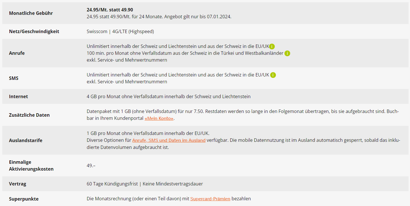 Zu beachten gilt lediglich, dass eine Kündigungsfrist von 60 Tagen gilt. Ausserdem kommen noch einmalig Aktivierungsgebühren für 49 Franken dazu.