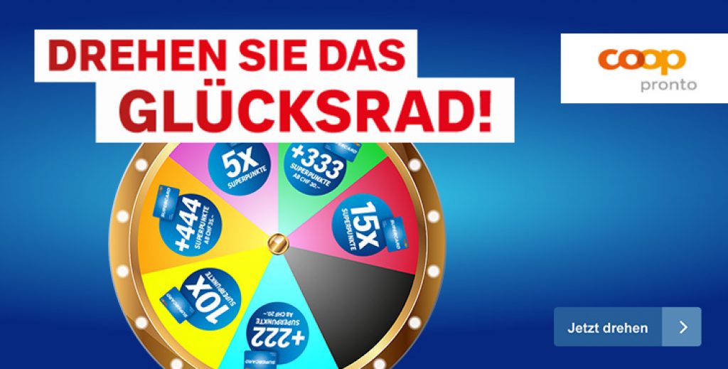 Drehen Sie mit uns am Rad! Bei Coop Pronto können Sie noch bis zum 30. Juni 2021 täglich am Glücksrad drehen und dabei attraktive Superpunkte für Ihren Einkauf bei Coop Pronto gewinnen.