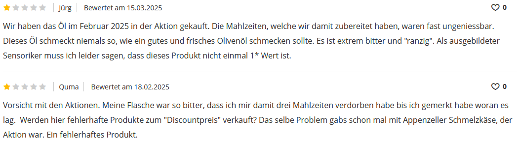 Wie der 2025er schmeckt, weiss ich ehrlich gesagt nicht. Morgen kaufe ich mir mal ’ne Flasche und bin echt neugierig, ob das wirklich so schlimm ist, wie dieser „ausgebildete Sensoriker“ behauptet. Wenn der schreibt, seine Mahlzeiten wären damit sogar ungeniessbar gewesen, muss das ja übel sein! Mir ist sowas jedenfalls noch nie passiert, selbst mit Monini nicht.