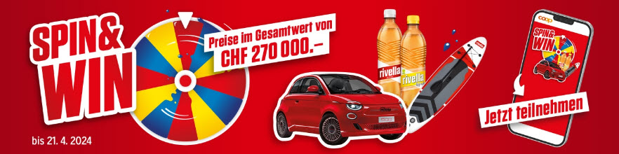 In der Coop App kann man vom 8. bis 21. April 2024 täglich einmal das Glücksrad drehen und Rivella Überraschungen gewinnen. Als Hauptpreis winkt am Ende des Gewinnspiels ein Fiat 500 Elektro im Wert von CHF 33’000.-.