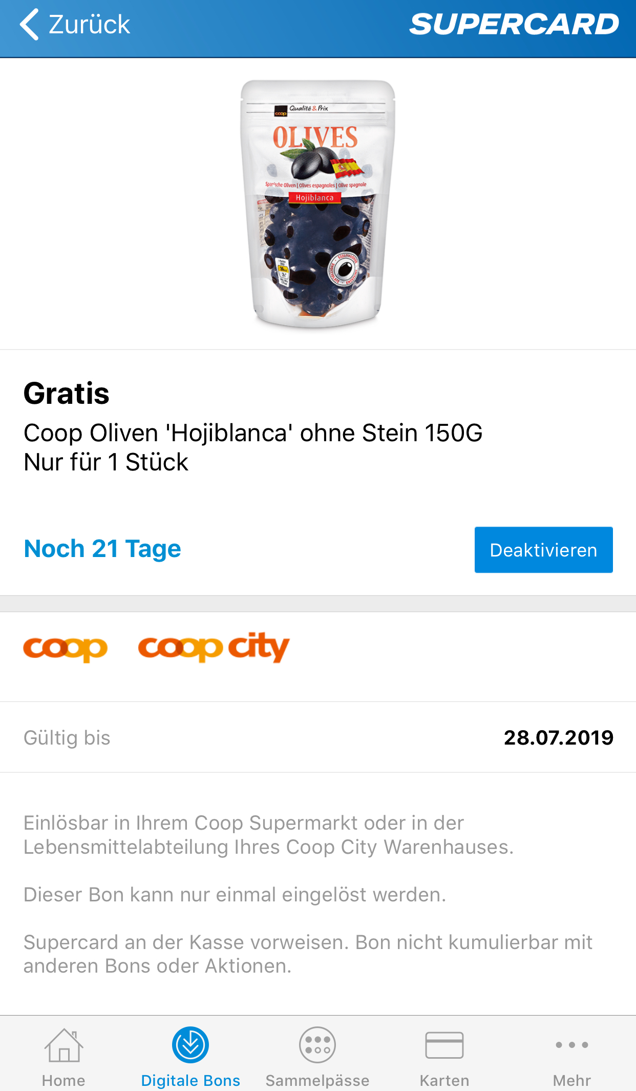 Über die coop supercard App gibt es aktuell eine Packung Coop Oliven „Hojiblanca“ ohne Stein 150g gratis.