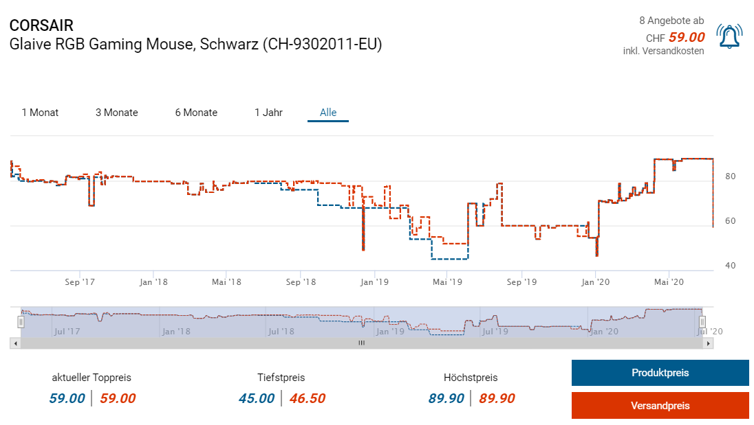 Bei microspot gibts derzeit noch 9 Stück der Gaming-Computermaus Glaive RGB vom Hersteller Corsair zum Aktionspreis von 59 Franken. Laut toppreise beträgt der zweitbeste Preis derzeit knapp 90 Franken, bei Amazon gibts die Maus aber schon für 76 Franken.