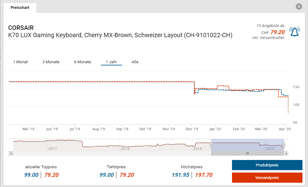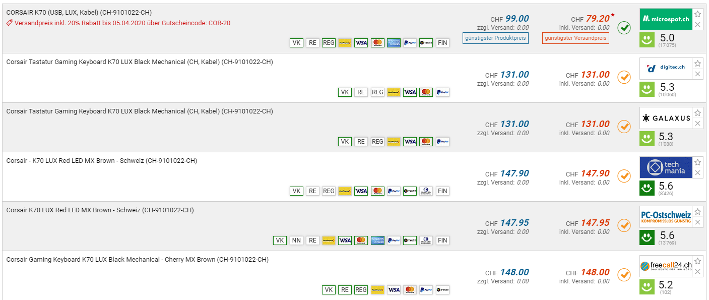 Bei Microspot gibt es das CORSAIR K70 Gaming-Keyboard für den neuen Bestpreis von CHF 79.20. Der vorherige Bestpreis war CHF 127.20. Der zweitbeste Preis beträgt CHF 131.-.