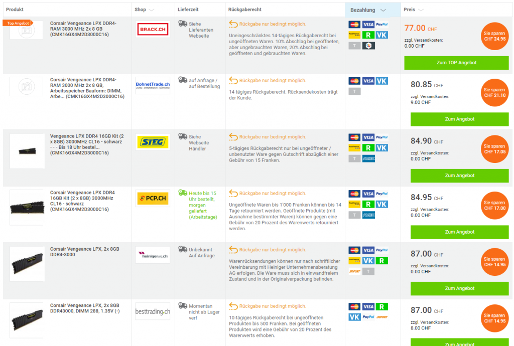 Bei digitec gibt’s die Corsair Vengeance LPX RAM für CHF 69.- Zweitbester Preis und gleichzeitig Bestpreis beträgt laut dem Comparis Vergleich CHF 77.-