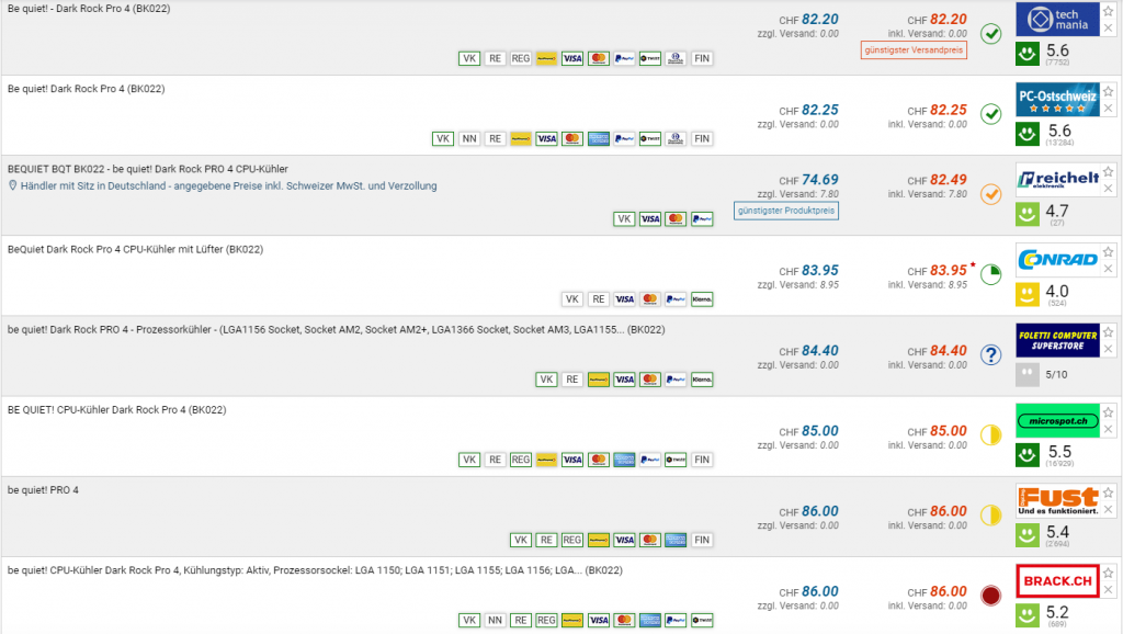 Bei digitec erhält man gerade den CPU Kühler be quiet! Dark Rock Pro 4 für CHF 69.- Zweitbester Preis zur Zeit ist bei CHF 82.20, Bestpreis laut toppreise bei CHF 75.-