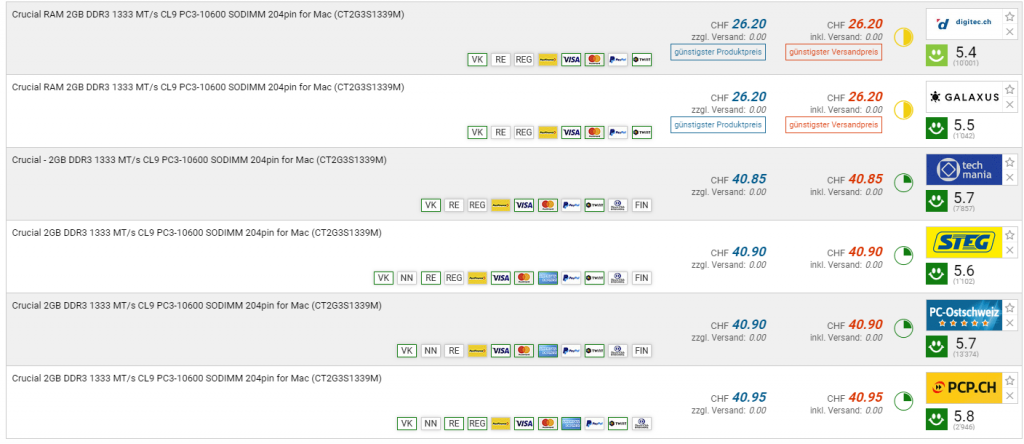 Bei digitec gibt es momentan den CRUCIAL 2.0GB Arbeitsspeicher für den neuen Bestpreis von CHF 26.20. Der vorherige Bestpreis lag bei CHF 37.85 und der zweitbeste Preis beträgt CHF 40.85. Bei dem Schwester-Shop Galaxus gibt es den Arbeitsspeicher für den gleichen Preis.