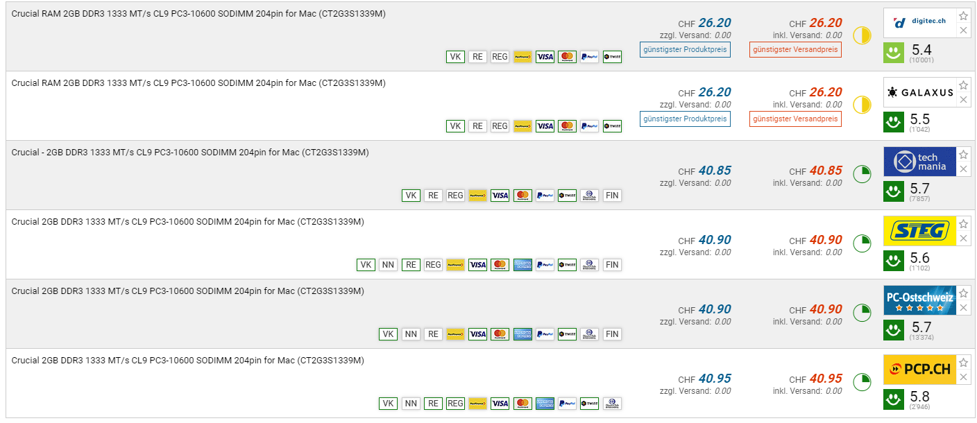 Bei digitec gibt es momentan den CRUCIAL 2.0GB Arbeitsspeicher für den neuen Bestpreis von CHF 26.20. Der vorherige Bestpreis lag bei CHF 37.85 und der zweitbeste Preis beträgt CHF 40.85. Bei dem Schwester-Shop Galaxus gibt es den Arbeitsspeicher für den gleichen Preis.