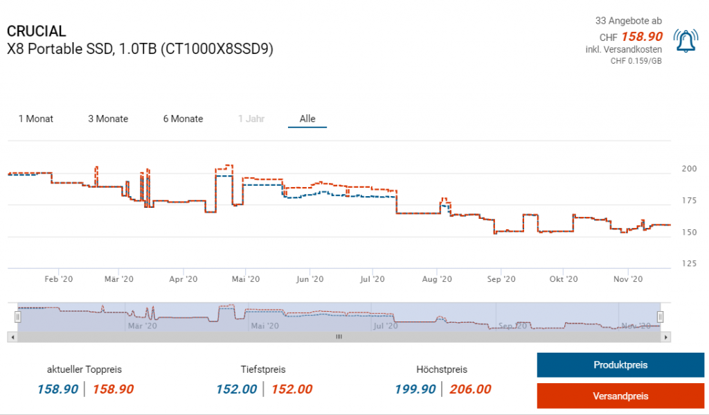 Bei Amazon gibts derzeit die portable SSD von Crucial mit 1TB Speicherkapazität zum Aktionspreis von knapp 111 Franken. Laut toppreise starten die Preise in der Schweiz sonst bei knapp 159 Franken. Wenn man dem Preisgraphen glauben kann handelt es sich zudem scheinbar um einen neuen Bestpreis.