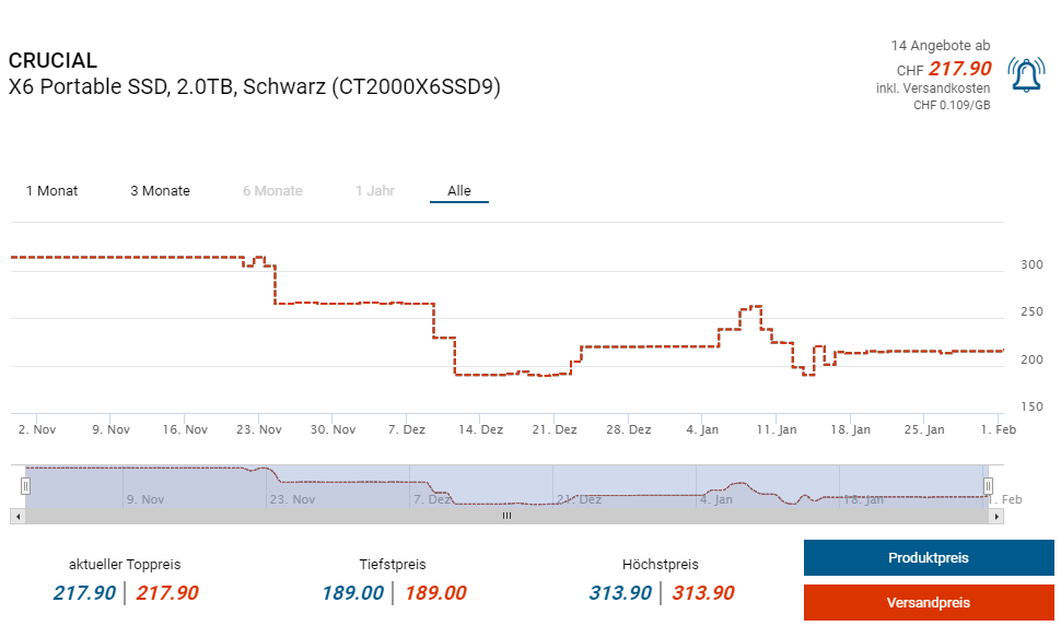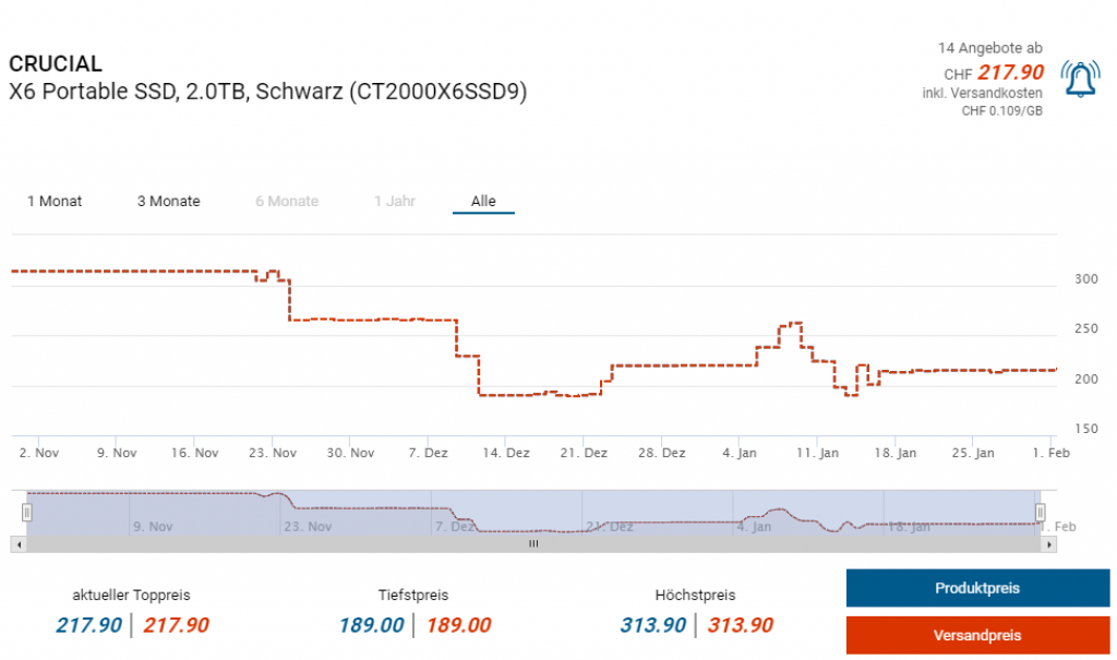 Bei Amazon Spanien gibts derzeit die externe SSD CT2000x6SSD9 von Crucial zum Aktionspreis vo 165 Franken inkl. Lieferkosten. Laut toppreise ein neuer Bestpreis (bisheriger Bestpreis bei 189 Franken).