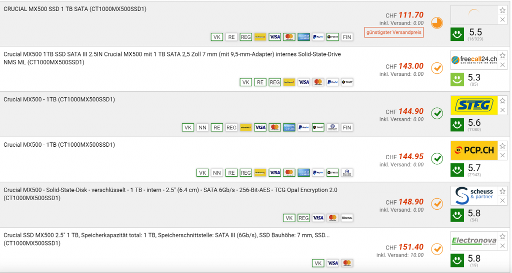 Bei digitec gibt’s grad die SSD Crucial MX500 (1000GB, 2.5″) für CHF 99.- Zweitbester Preis beträgt CHF 111.70, das ist gleichzeitig der Bestpreis.