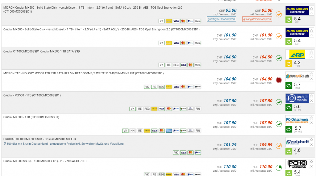 Bei Amazon gibt’s gerade die 1TB SSD Crucial MX500 für CHF 78.50 inklusive Versand in die Schweiz und Verzollung. In der Schweiz kostet das Teil ab CHF 95.-