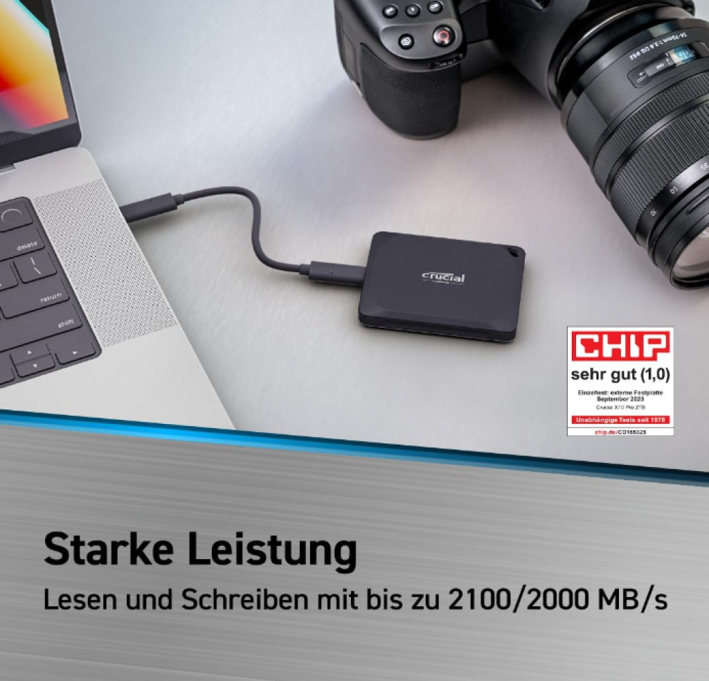 - Echte Geschwindigkeit. Wahnsinnige Leistung: Mit Lese- und Schreibgeschwindigkeiten von bis zu 2.100/2.000 MB/s ist die tragbare SSD Crucial X10 Pro leistungsstark genug, um direkt von der Festplatte aus zu bearbeiten.