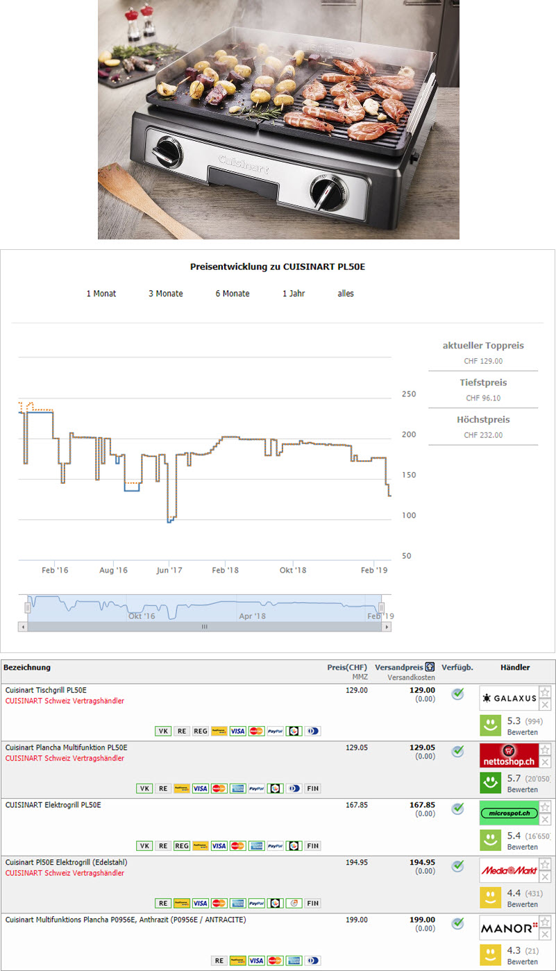 Aktuell gibt es total 5 Stück des Cuisinart PL50E Tischgrills bei Galaxus für jeweils CHF 129.- (der nächstbeste Preis liegt bei CHF 167.85).
