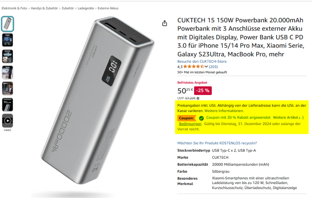 Den CUKTECH 15 150W 20.000mAh Powerbank mit 3 Anschlüssen findet ihr bei Amazon zu einem Preis von umgerechnet 37.25 Franken. Damit ihr auf den Preis kommt, müsst ihr einfach den 20 %-Rabattcoupon aktivieren. Dieser ist bis und mit dem 31.12. gültig, solange der Vorrat reicht.