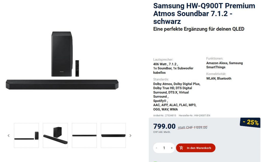 - Lautsprecher: 406 Watt , 7.1.2 , 1x Soundbar, 1x Subwoofer kabellos