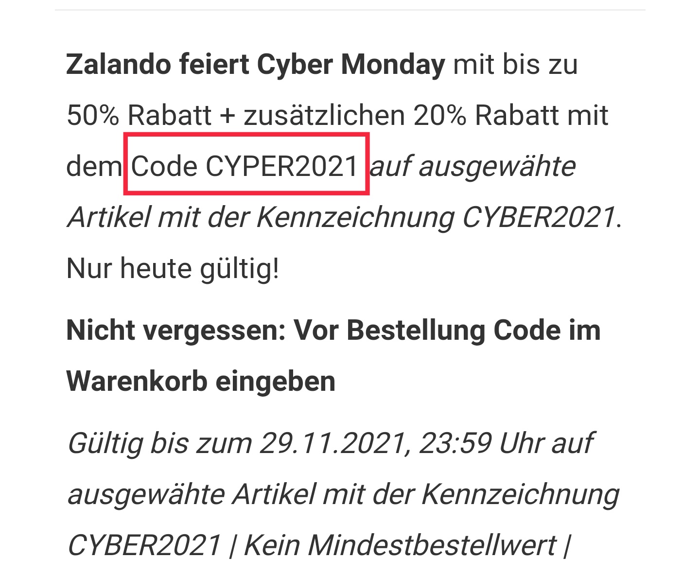 Gültig bis zum 29.11.2021, 23:59 Uhr auf ausgewähte Artikel mit der Kennzeichnung CYBER2021 | Kein Mindestbestellwert | Keine Barauszahlung möglich | Gutschein ist nicht kombinierbar | Gilt nicht für Geschenkgutscheine und Zalando Lounge | Solange der Vorrat reicht