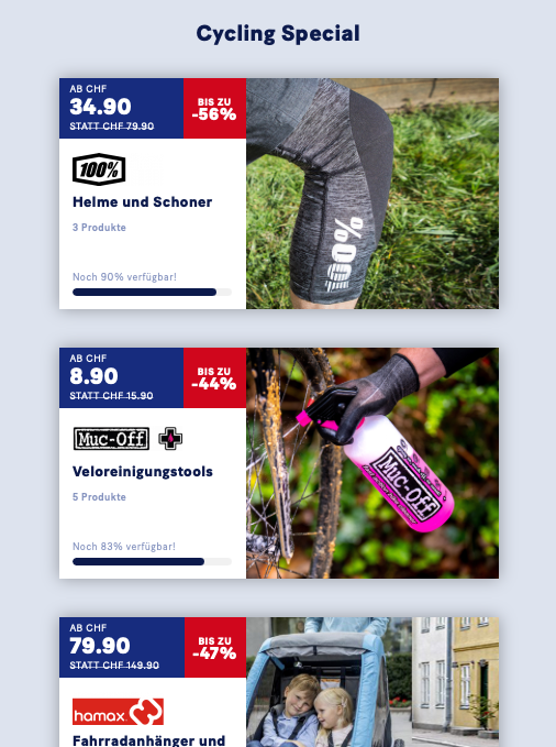 Bei 20min.ch gibts heute den Cycling-Special. Es gibt alles von Schlössern bis Helme. Alle 4 Stunden kommt ein neuer Brand dazu.