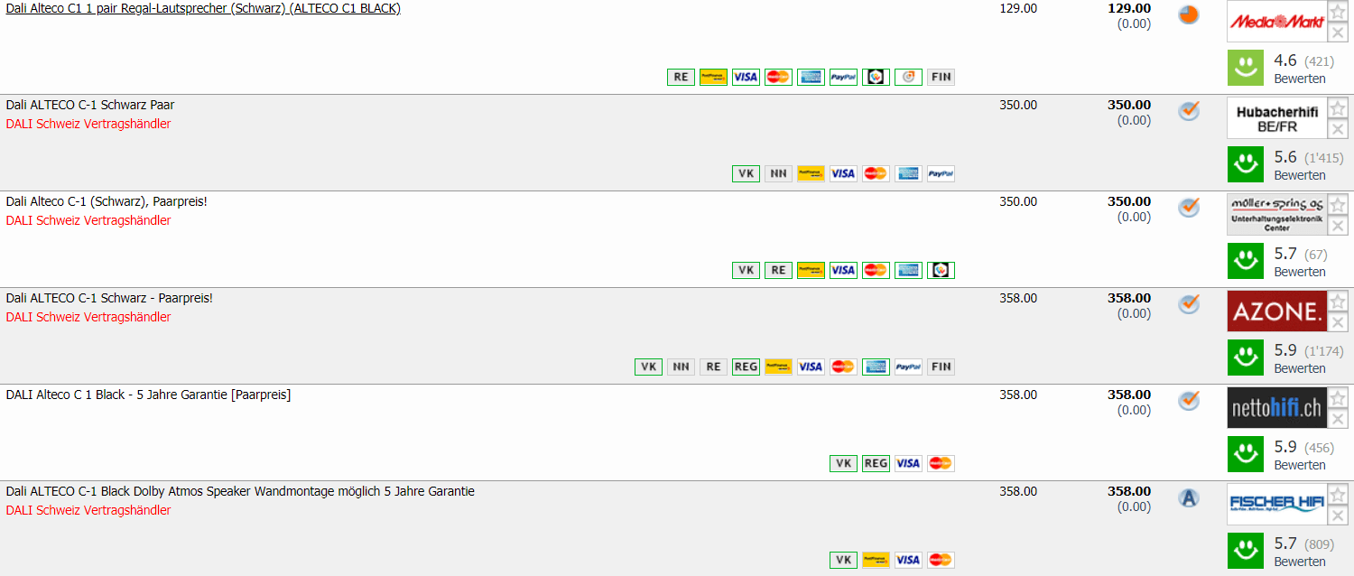 Bei MediaMarkt gibt’s gerade ein paar DALI ALTECO C1 1 Regal-Lautsprecher für CHF 129.- Zweitbester Preis in der Schweiz ist bei CHF 350.- wobei zu sagen ist, dass nur ein paar kleine Händler den Regallautsprecher im Sortiment haben. Bestpreis war bei CHF 195.- was ich auch als Vergleichspreis nehme.