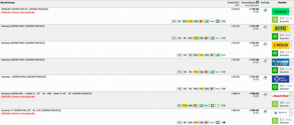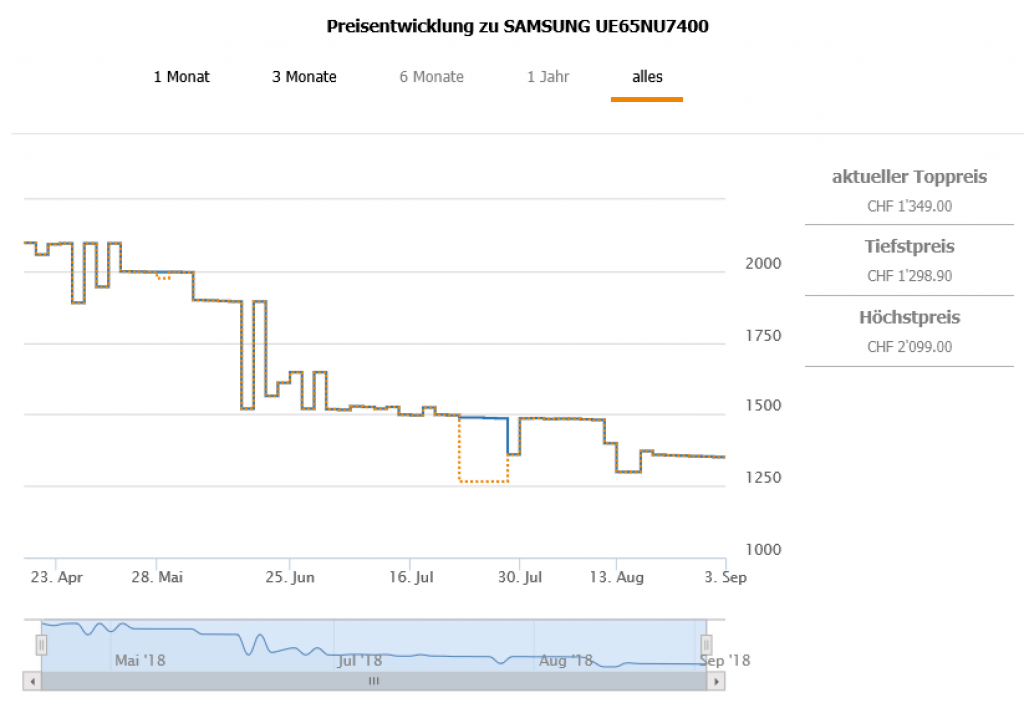 Gemäss toppreise gab es den TV bislang nie günstiger als für 1265.65 CHF, der zweitbeste Preis liegt aktuell bei 1349.- CHF.