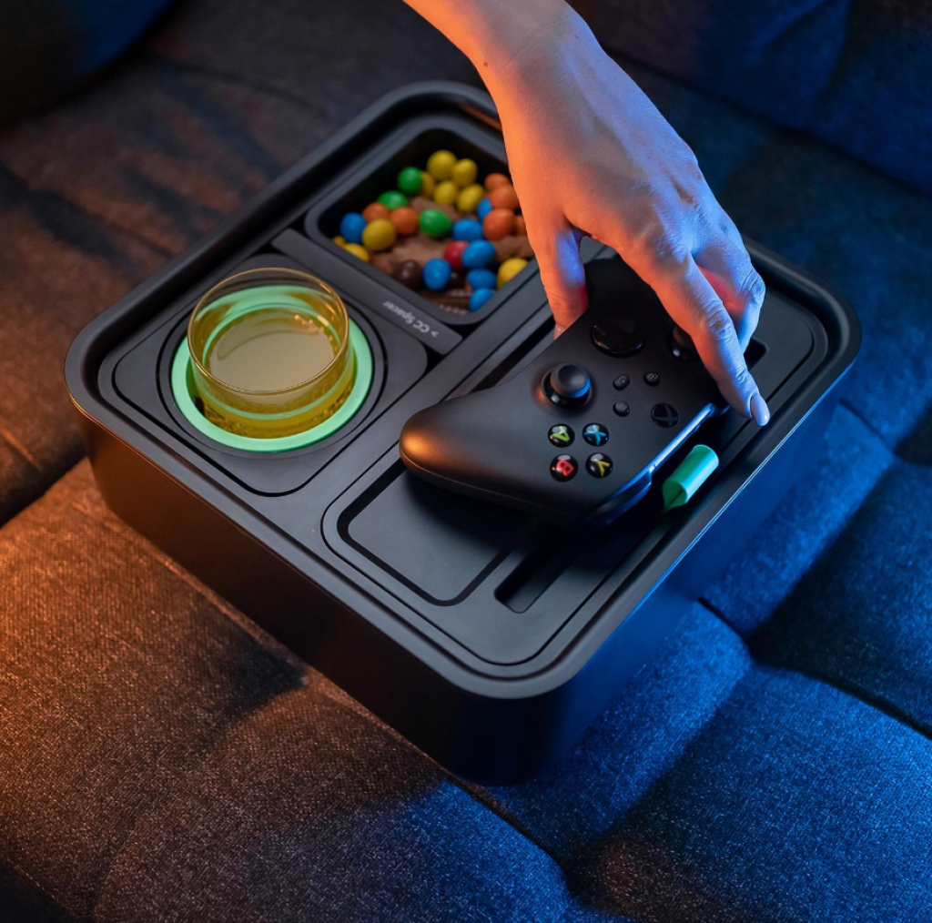 - Mit Getränkehalter, Snackhalter, Telefonständer, Ladestation, Fernbedienungsablage und Aufbewahrungstasche