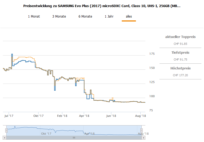 Gemäss toppreise gab es die Speicherkarte noch nie günstiger als für 91.75 CHF, der zweitbeste Preis liegt aktuell bei 91.85 CHF.