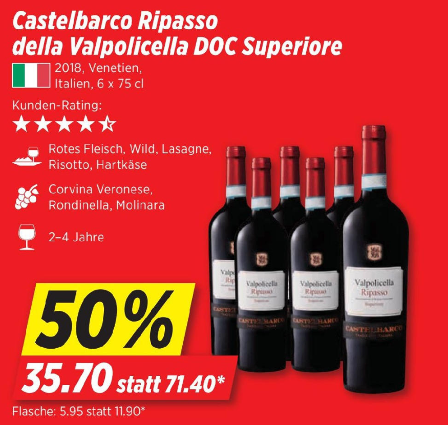 Im Wochenendknaller profitiert ihr zudem von 50% Rabatt auf das 6er-Pack Rotwein-Flaschen Castelbarco Ripasso della Valpolicella DOC Superiore. So zahlt ihr nur noch 35.70 Franken resp. CHF 5.95 pro Flasche!