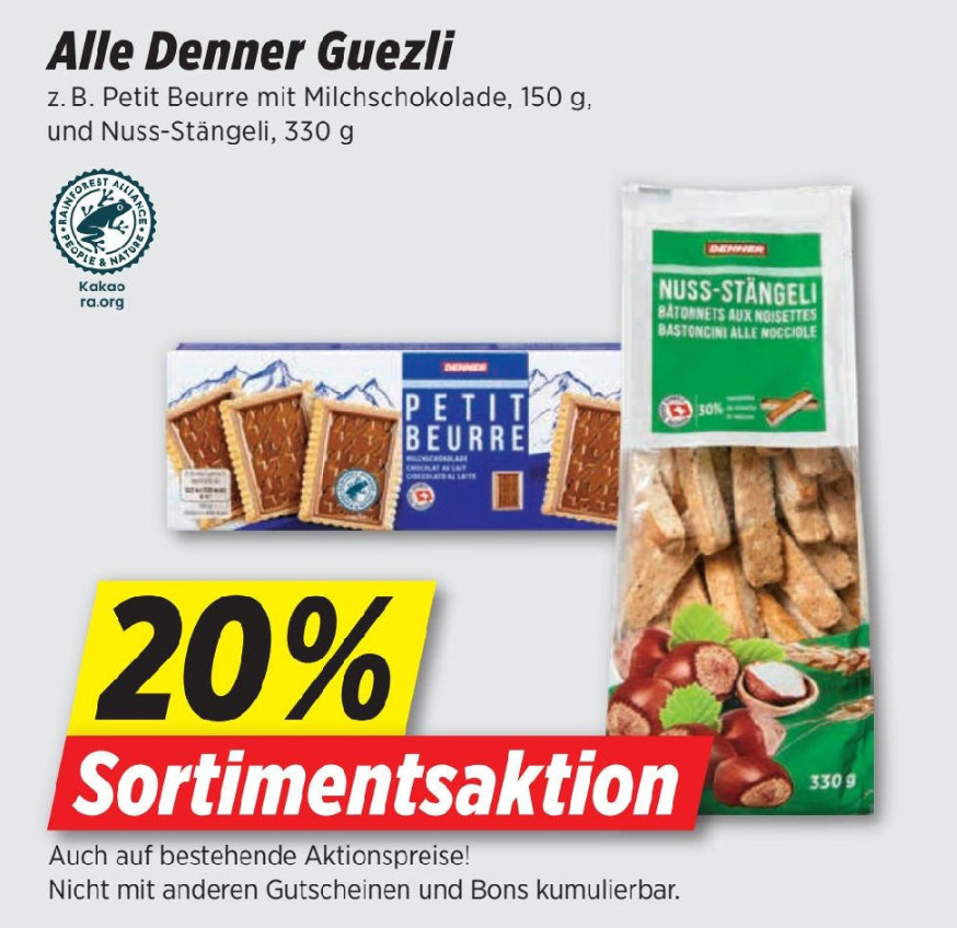 Zum Beispiel gibt’s diese Woche einen Sortimentsrabatt von 20% auf alle Denner Guetzli. Der Rabatt gilt dabei auch auf bestehende Aktionspreise, wodurch man kräftig sparen kann!